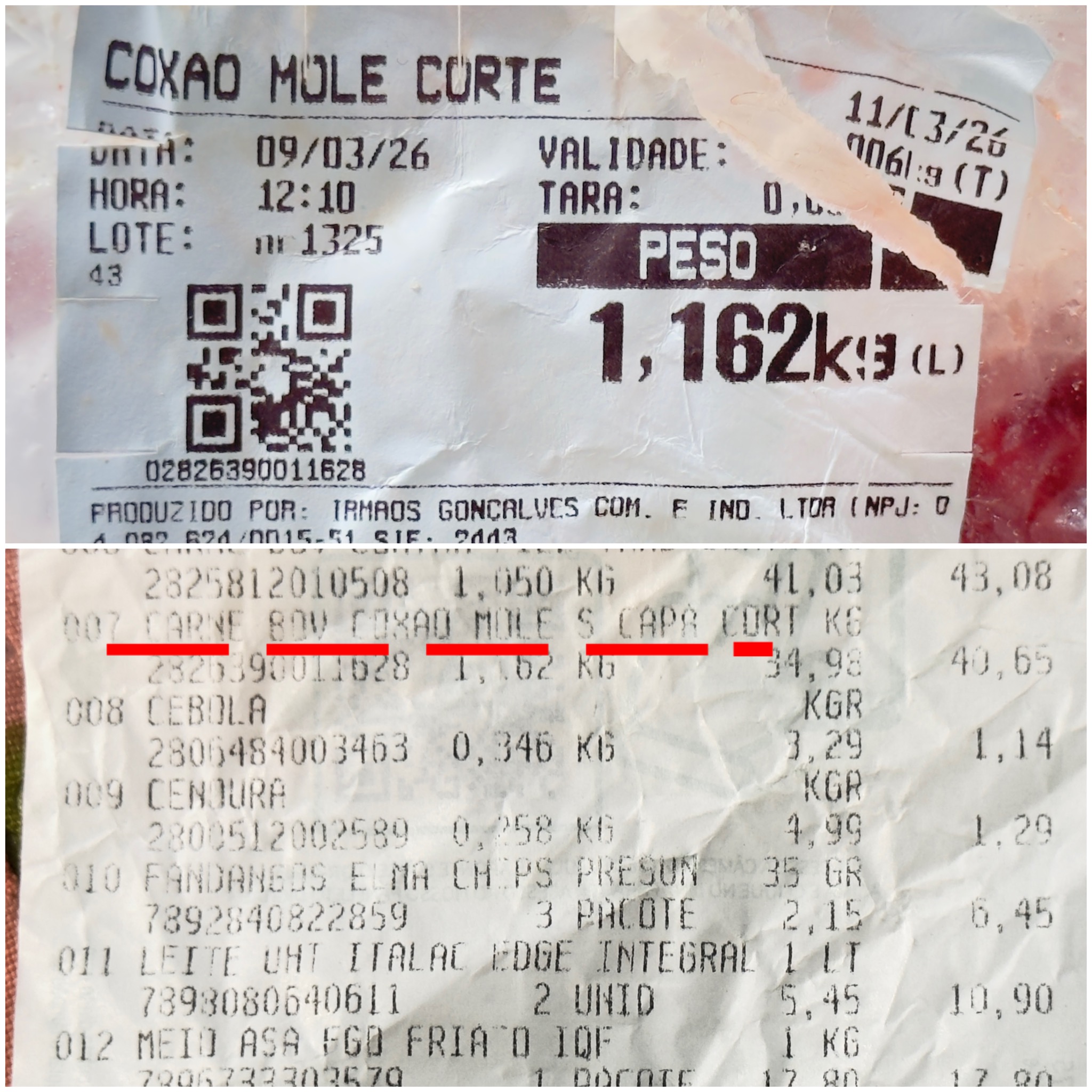 Segundo o consumidor, no momento do atendimento o corte ultrapassou um pouco o peso solicitado, passando de um quilo, e ele aceitou pagar a diferença normalmente. No entanto, ao chegar em casa, teve uma grande surpresa ao abrir a embalagem.