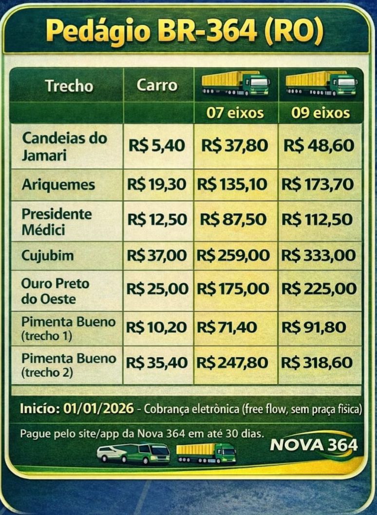 A divulgação oficial das tarifas de pedágio previstas para a BR-364 gerou forte reação entre moradores de Rondônia e usuários da rodovia. Considerada o principal corredor logístico do estado, a BR-364 é essencial para o transporte de cargas, produção agrícola, abastecimento e deslocamento da população. Diante desse cenário, os valores anunciados foram recebidos com críticas e apontados como desproporcionais à realidade da via, historicamente marcada por problemas estruturais, alto índice de acidentes e constantes prejuízos aos usuários.