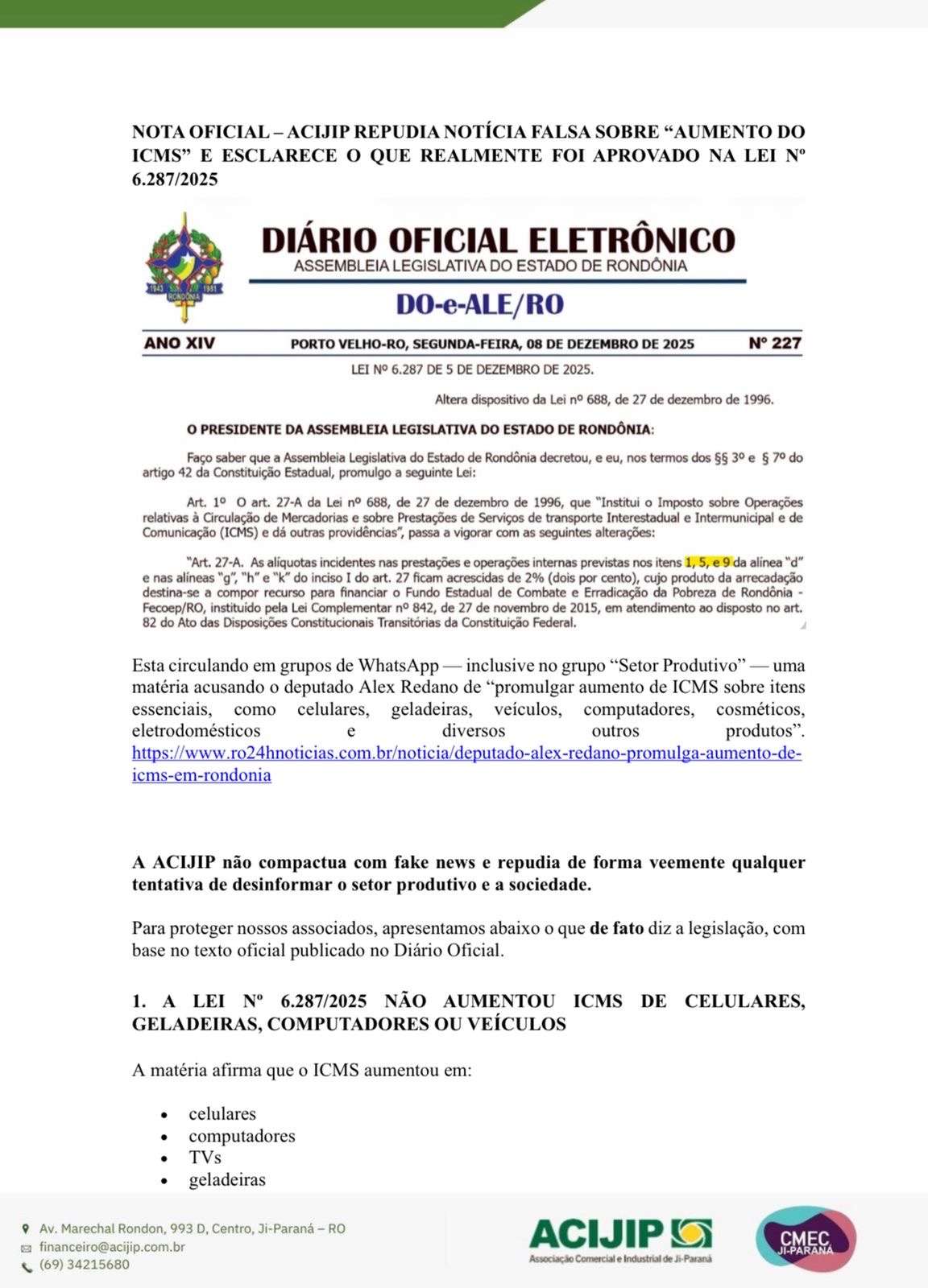 A nota oficial ressalta que não há, em nenhuma parte da Lei nº 6.287/2025, qualquer menção a aumento de ICMS sobre celulares, notebooks, televisores, geladeiras, fogões, ar-condicionado, máquinas de lavar, veículos ou cosméticos. Para a ACIJIP, a lista de produtos divulgada pelos sites é inteiramente inventada e não encontra respaldo no texto legal publicado no Diário Oficial.
