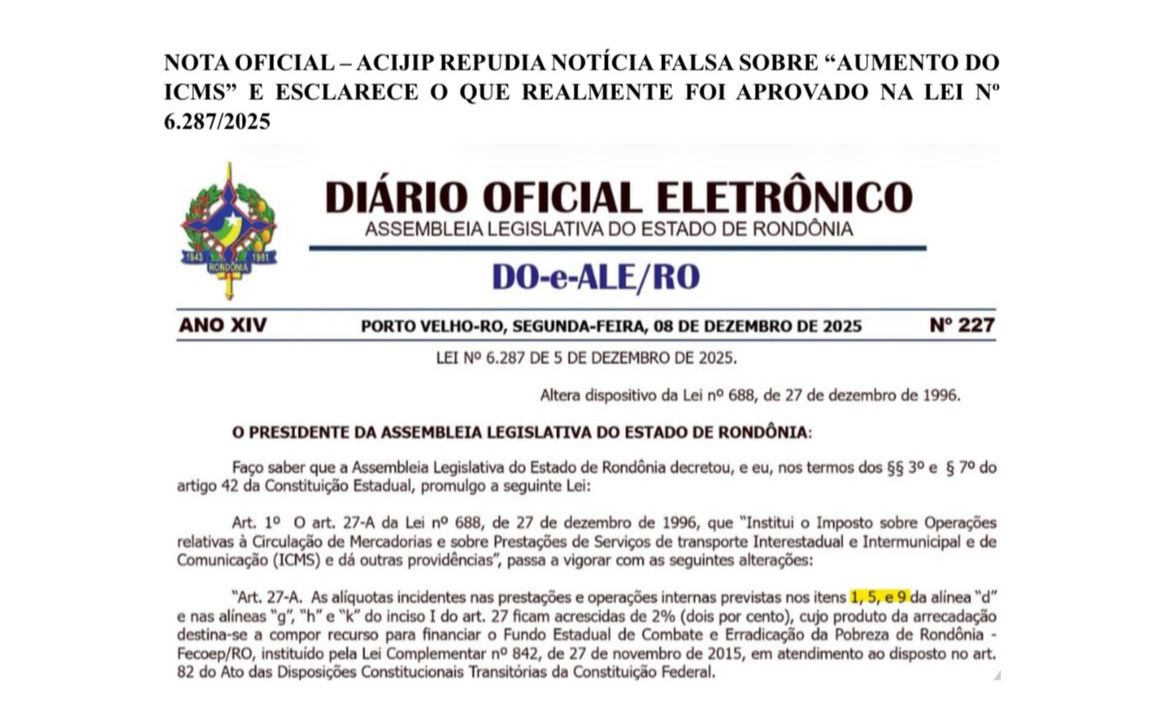 A nota oficial ressalta que não há, em nenhuma parte da Lei nº 6.287/2025, qualquer menção a aumento de ICMS sobre celulares, notebooks, televisores, geladeiras, fogões, ar-condicionado, máquinas de lavar, veículos ou cosméticos. Para a ACIJIP, a lista de produtos divulgada pelos sites é inteiramente inventada e não encontra respaldo no texto legal publicado no Diário Oficial.