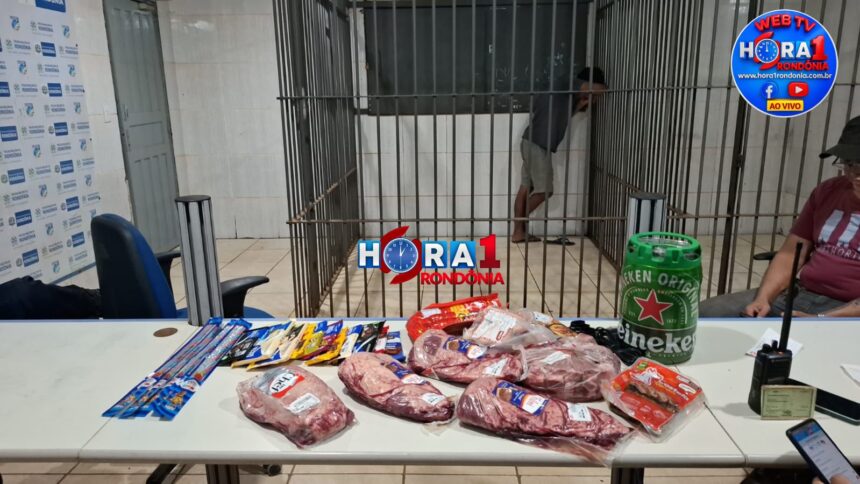 De acordo com as informações apuradas, o suspeito teria entrado no estabelecimento comercial e, aproveitando-se de um momento de distração, colocado vários itens em sacolas antes de tentar sair sem efetuar o pagamento. Entre os produtos levados estavam quatro peças de picanha, vários pacotes de chocolate, um pequeno barril de cerveja Heineken, além de bacon, calabresa, doces, uma extensão elétrica e outros itens alimentícios.