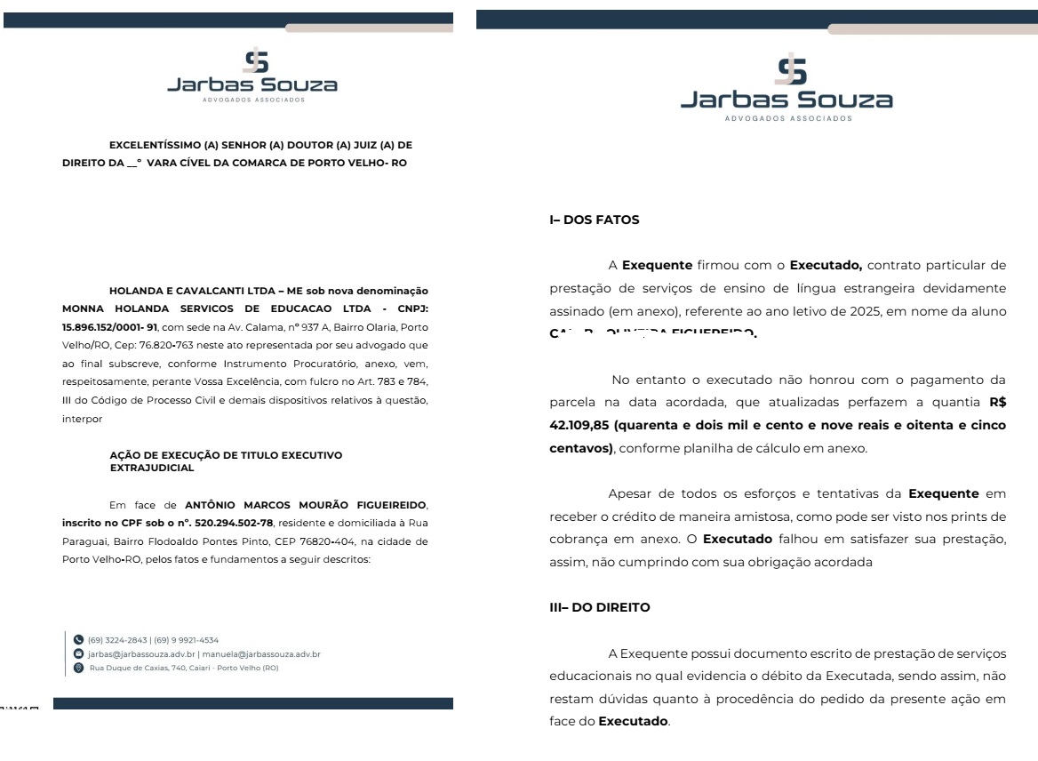 Consta nos autos dos processos nº 7075247-02.2025.8.22.0001 e nº 7075252-24.2025.8.22.0001 que há débitos educacionais relevantes em aberto. De acordo com a instituição credora, Maple Bear, operada pela empresa Monna Holanda Serviços de Educação Ltda., o parlamentar acumularia uma dívida de R$ 48.090,14 referente a um aluno e outros R$ 42.109,85. Somados, os valores ultrapassam com folga a barreira dos noventa mil reais.