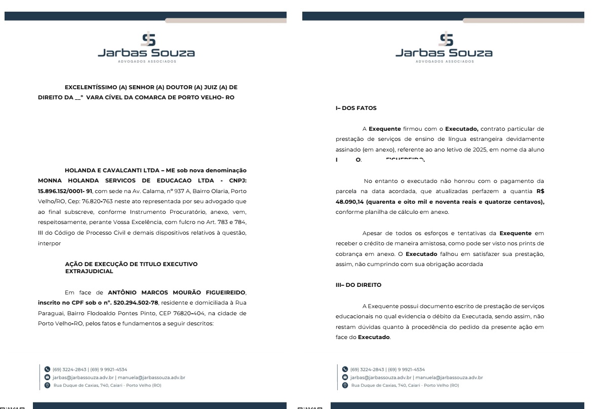 Consta nos autos dos processos nº 7075247-02.2025.8.22.0001 e nº 7075252-24.2025.8.22.0001 que há débitos educacionais relevantes em aberto. De acordo com a instituição credora, Maple Bear, operada pela empresa Monna Holanda Serviços de Educação Ltda., o parlamentar acumularia uma dívida de R$ 48.090,14 referente a um aluno e outros R$ 42.109,85. Somados, os valores ultrapassam com folga a barreira dos noventa mil reais.