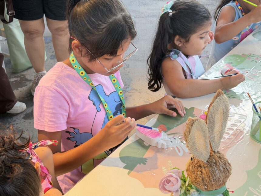 Ao lado da irmã Maria Clara, de 10 anos, a pequena Maria Eduarda, de 12, se concentrava nos detalhes enquanto dava vida a um ovo de Páscoa com pinceladas coloridas. As duas participaram da oficina acompanhadas da mãe, Maria Andreia, dona de casa, e encontraram no espaço uma oportunidade de sair da rotina e mergulhar na criatividade.