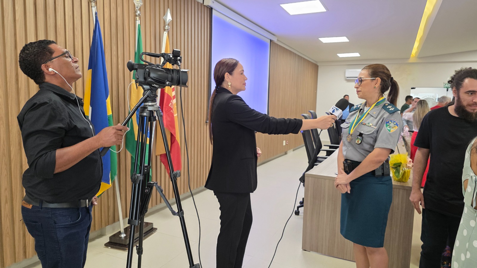 O cinegrafista Ednei Silva e a jornalista Eláine Maia, da Secom, durante entrega de honrarias em Ji-Paraná (Foto: Ivanete Damasceno I Secom ALE/RO)
