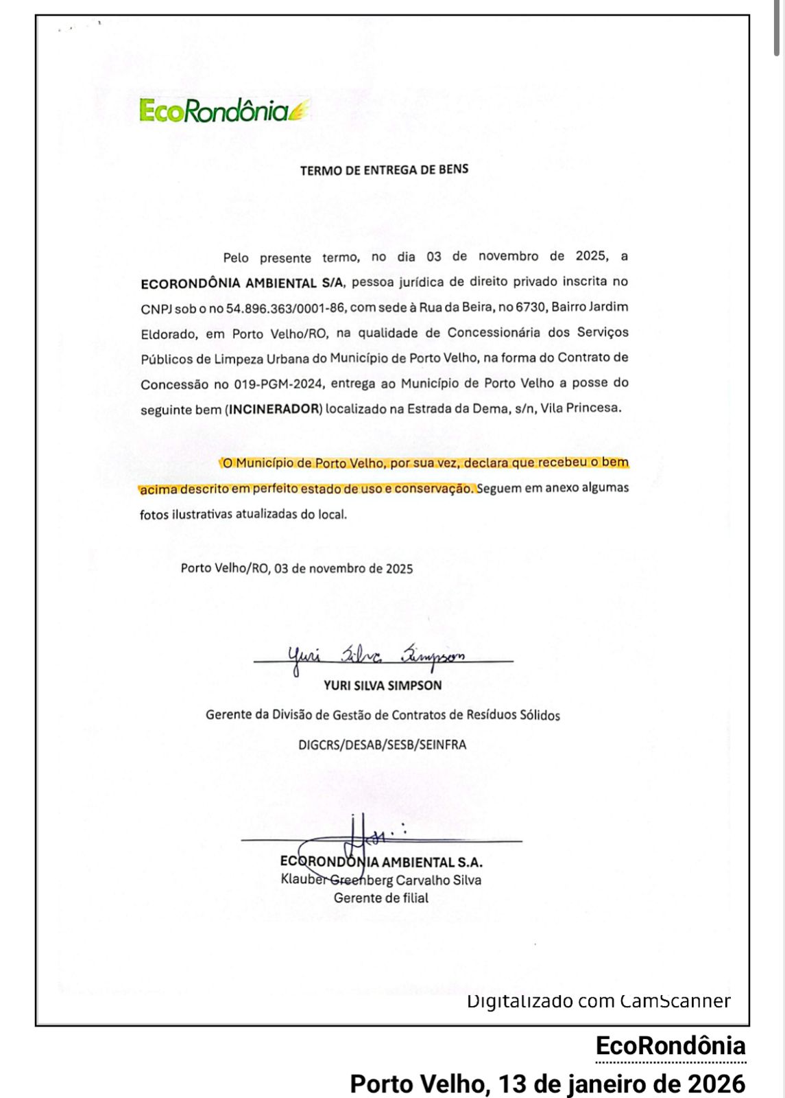 A EcoRondônia reafirma seu compromisso com a legalidade, a eficiência operacional e a transparência, e informa que documentos, registros técnicos e imagens comprovam a regularidade da entrega do equipamento.