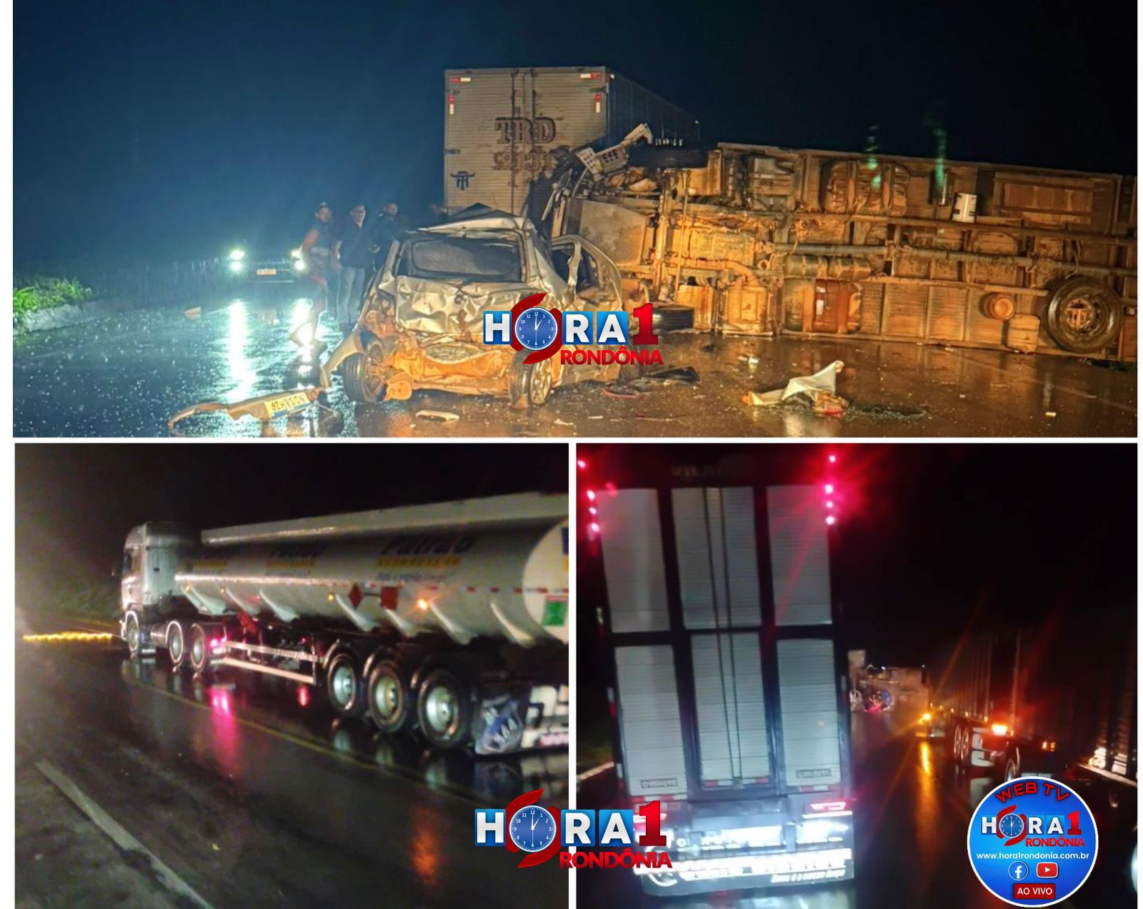 Um grave acidente de trânsito envolvendo dois caminhões e um carro de passeio foi registrado na noite desta terça-feira (14), na altura do km 50 da BR-364, no município de Candeias do Jamari, região metropolitana de Porto Velho.