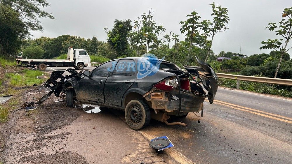 O impacto foi forte e deixou o automóvel bastante danificado, especialmente na parte frontal. O caminhão, por sua vez, sofreu avarias no eixo traseiro, mas conseguiu permanecer no local até a chegada das autoridades.