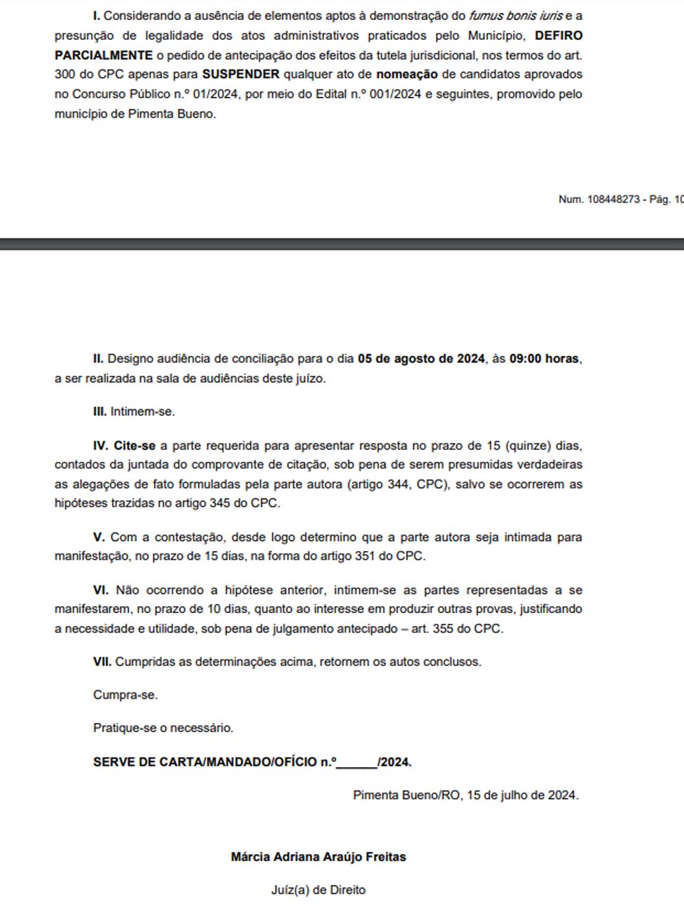 Porto Velho, RO – Em resposta à ação civil pública ajuizada pelo Ministério Público do Estado de Rondônia (MPRO), a Justiça de Rondônia determinou a suspensão das nomeações de candidatos aprovados no Concurso Público nº 01/2024, realizado pelo Município de Pimenta Bueno. A decisão, emitida pela juíza Márcia Adriana Araújo Freitas, da 1ª Vara Cível de Pimenta Bueno, foi fundamentada em denúncias de irregularidades que comprometem a integridade do certame.