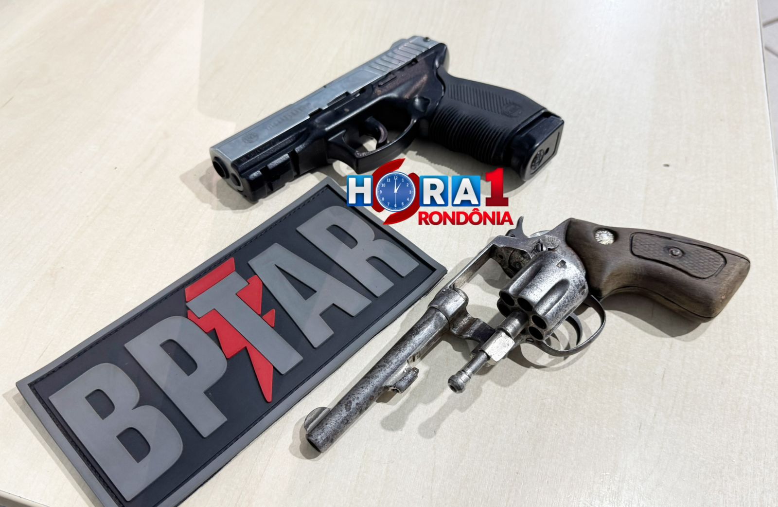 Durante a perseguição, os policiais visualizaram o momento em que um dos suspeitos arremessou uma arma para o quintal dos fundos. Com o apoio das guarnições MX-02 e MX-03, os militares conseguiram deter os suspeitos e localizar, no terreno indicado, um revólver calibre .32, oxidado e sem numeração aparente, além de um simulacro de pistola.