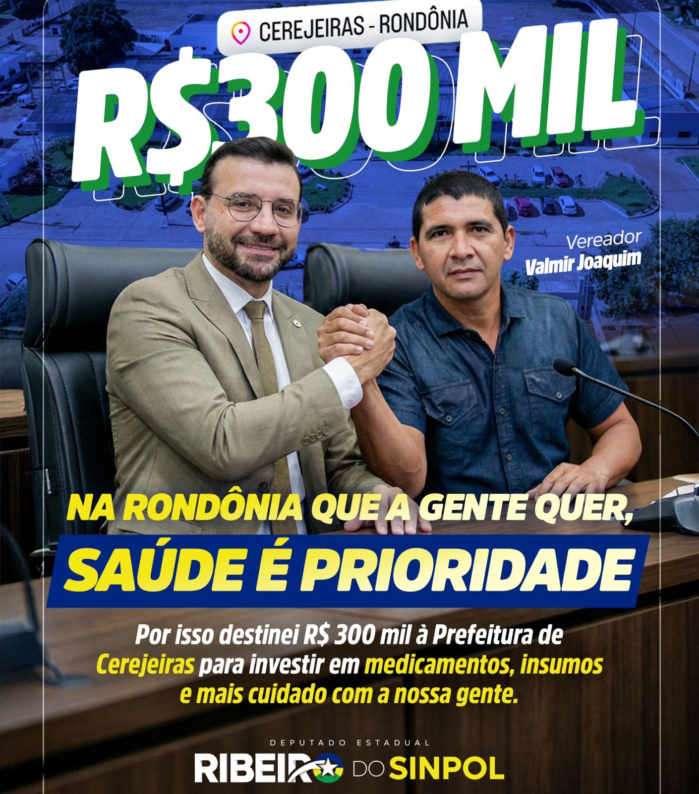 O deputado estadual Ribeiro do Sinpol (PRD) destinou emenda parlamentar no valor de R$ 300 mil ao município de Cerejeiras, recurso que será aplicado na compra de medicamentos, insumos e no fortalecimento das ações de assistência à população.